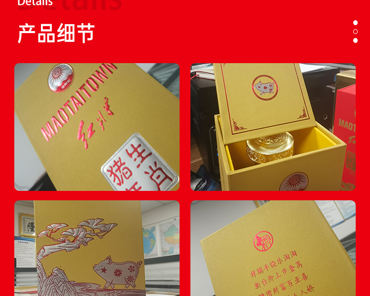 瓶身的朱红底色晕染着节庆的暖意,恰似年画里 “肥猪拱门” 的喜庆意象跃然眼前。烫金浮雕的福猪憨态可掬,纹路间藏着 “家” 字的本源密码 —— 古汉字中 “豕居屋下为家”,这灵韵流转的纹饰,正是把 “无猪不成家” 的团圆期许细细镌刻。瓶颈的鎏金饰边轻绕,既似锁住时光的印记,又暗合 “金猪纳福” 的古老祝愿,将生肖文化的厚重与生活的热忱凝于一瞬。